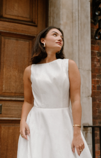 She is timeless. She is elegant. She is Sansa. She is a sleek A-line silhouette that flows effortlessly into a sweeping train. The back of the dress showcases an illusion lace pane, adding a touch of romance and intricate detail to the minimalist design. With her blend of modern simplicity and delicate lace detailing, this gown is perfect for the bride who seeks understated elegance with a touch of vintage charm.