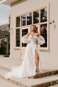 Seleste, meaning heavenly is the perfect name for this iconic gown. seleste evokes sparkling beauty and grandeur themes. she has unique features such as her soft puff sleeves and high leg split. Like nothing Sempre Sophia has seen before, this is Seleste.