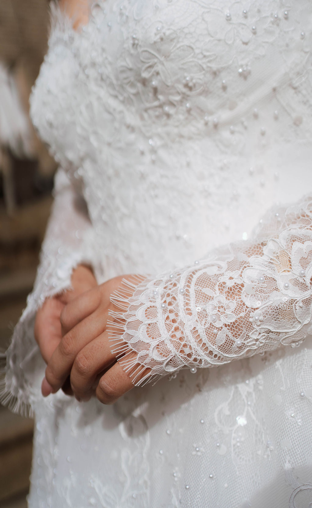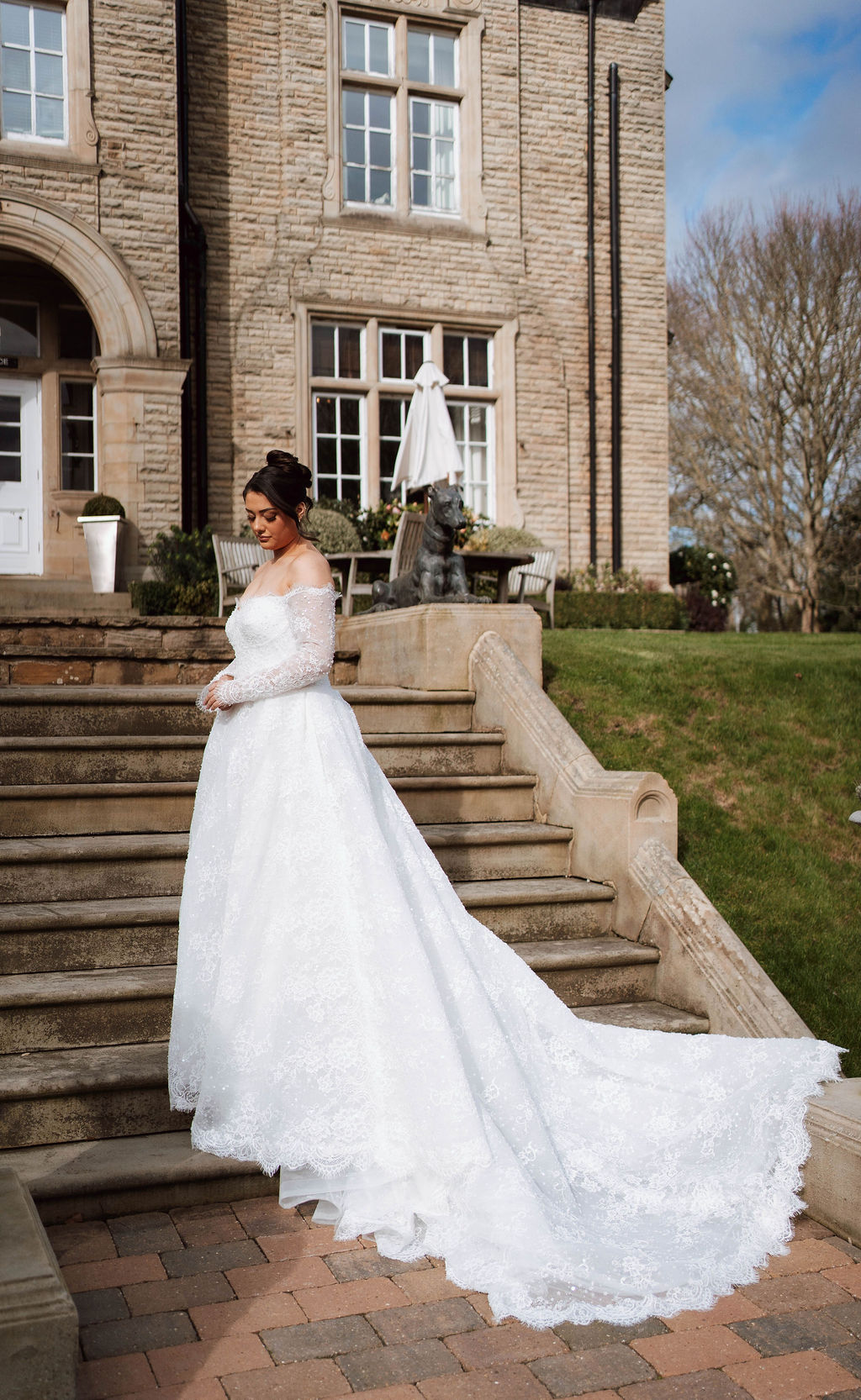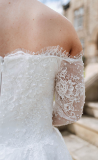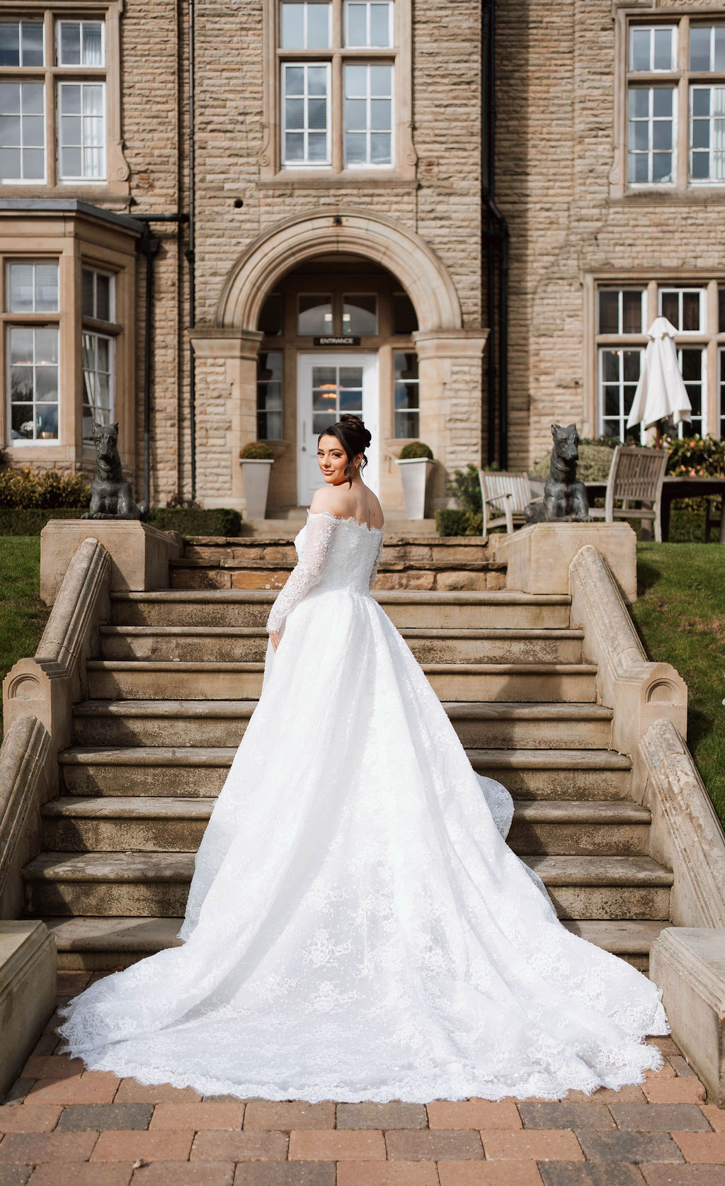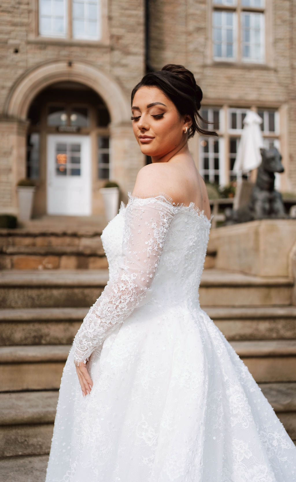 The structured bodice is adorned with intricate lace detailing, delicately shaping the figure while highlighting the neckline and shoulders with a romantic off-the-shoulder design and elegant long lace sleeves. The luxurious ivory tones enhance the richness of the lace, creating a timeless and sophisticated bridal look.