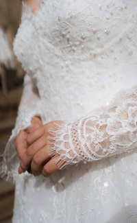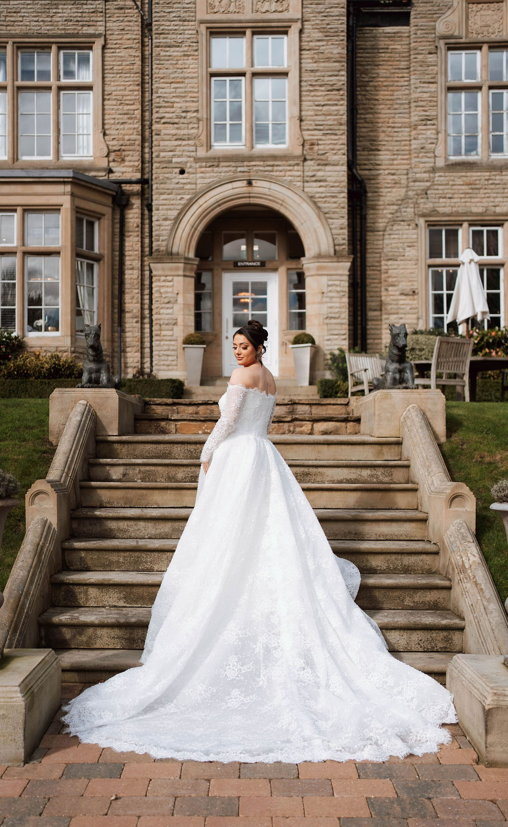 From the defined waist flows a dramatic princess ballgown skirt, full of volume and movement. Layers of soft fabric create a magnificent silhouette, while the sweeping train and delicate lace edging add a touch of classic romance worthy of a royal aisle moment.