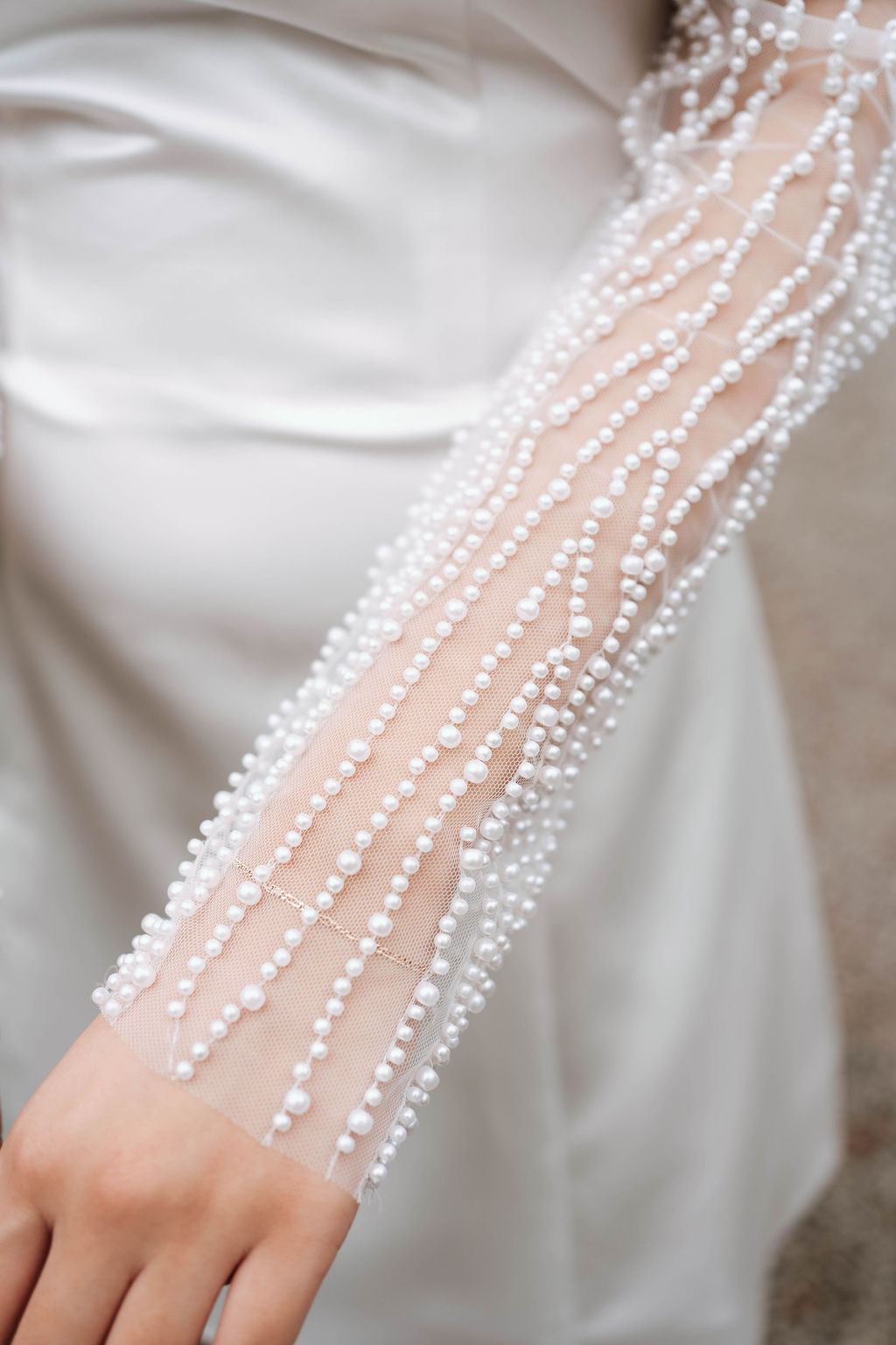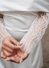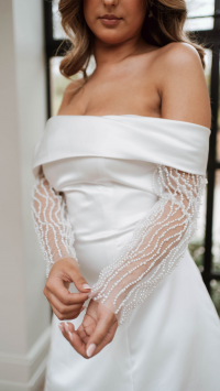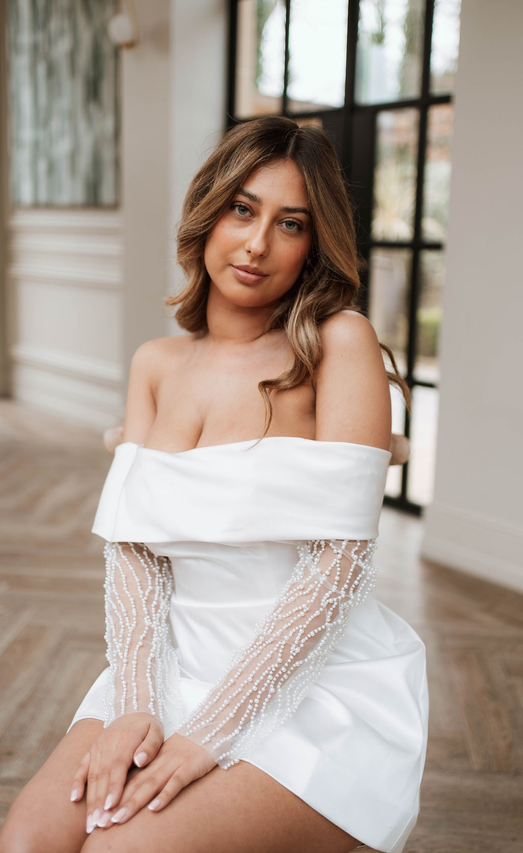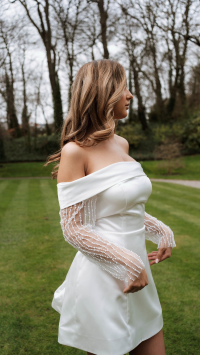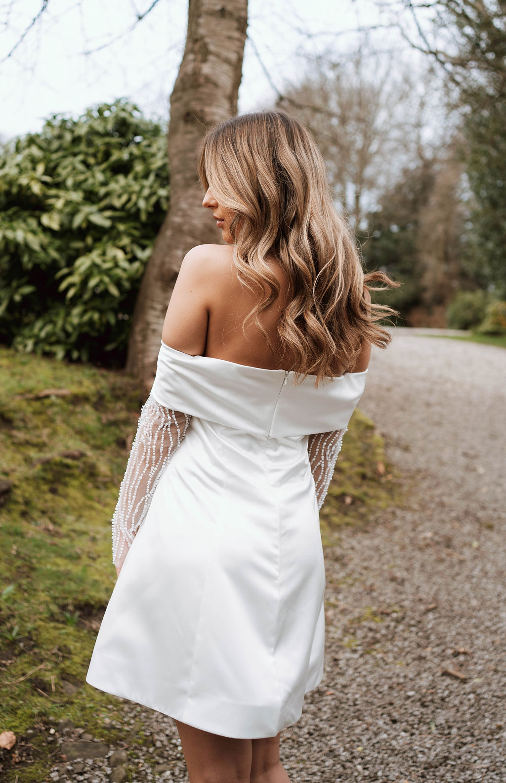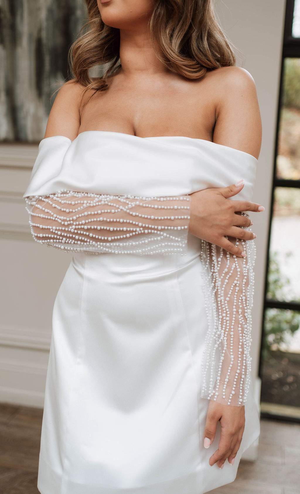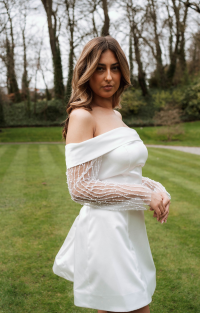 The Astra mini dress is crafted in luxurious mikado, featuring eye-catching embellished sleeves that add a touch of sparkle. Its double-front layering creates depth and movement, offering a modern, fashion-forward silhouette perfect for brides who want effortless elegance with a bold statement