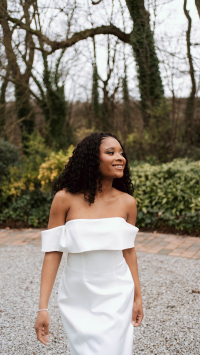 The Cleo gown is a modern statement in luxurious mikado. Its off-the-shoulder draping forms a chic straight neckline, while the structured skirt showcases the fabric’s thick, sumptuous quality and impeccable shape. Minimalist yet striking, Cleo combines contemporary elegance with refined tailoring, perfect for brides seeking a sleek, fashion-forward look.
