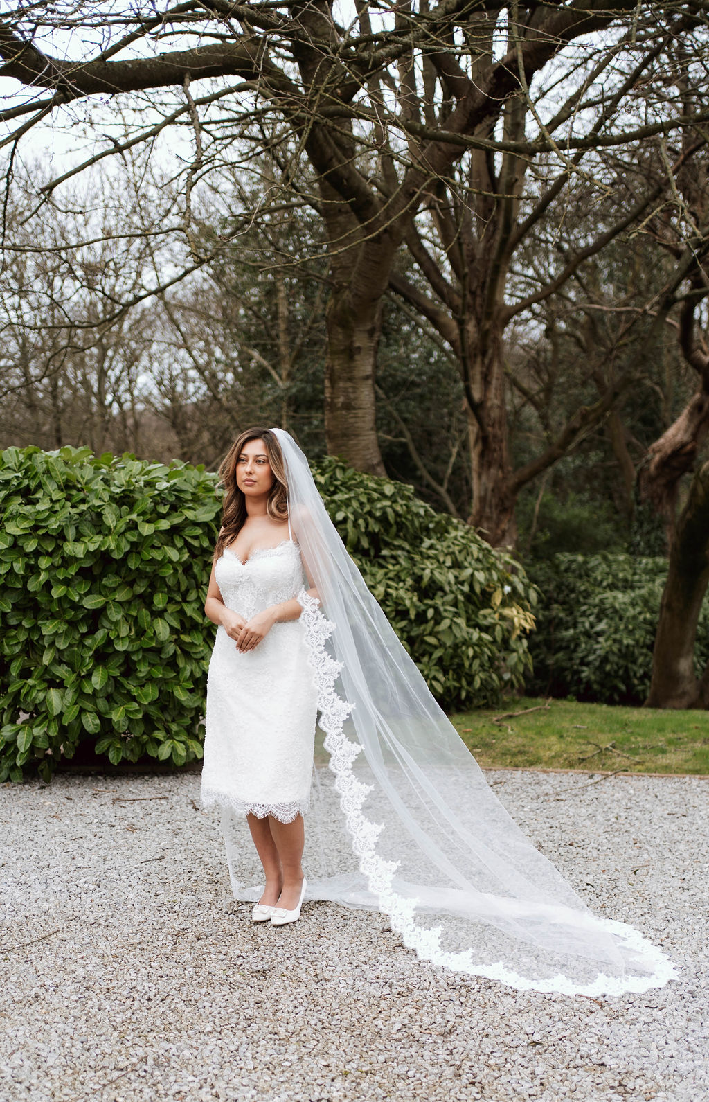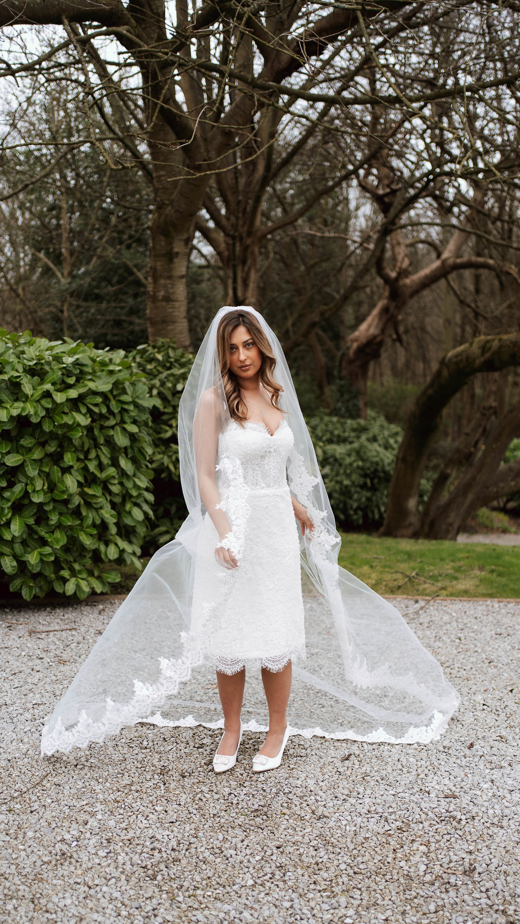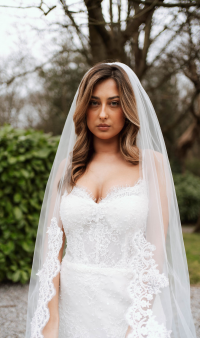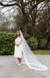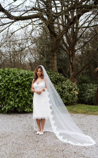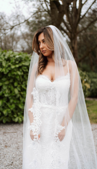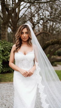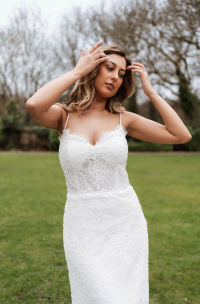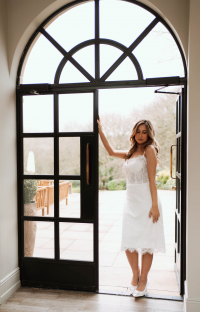 The Lyra Mini Gown is a stunning display of refined craftsmanship, crafted in delicate ivory Chantilly lace. Subtle beaded embellishments add a touch of sparkle, highlighting the intricate lace pattern and exquisite detailing. Soft satin straps add a romantic, feminine touch, while the expertly structured silhouette flatters the figure. This mini gown blends timeless elegance with modern sophistication, perfect for brides seeking a chic, luxurious look for intimate weddings or special bridal events