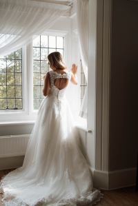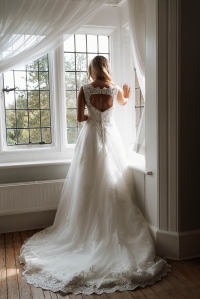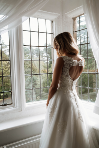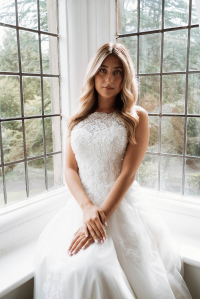 The sweetheart bust is perfectly paired with a high illusion neckline, encrusted with beads for a gorgeous princess sparkle - and the keyhole back adds the perfect accent to a high neckline at the front.