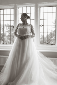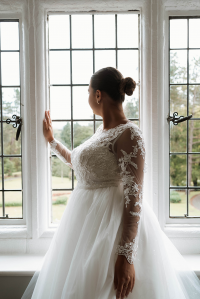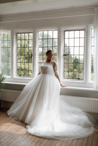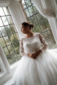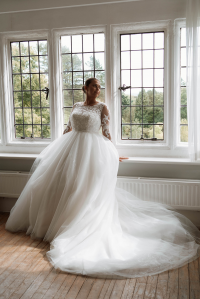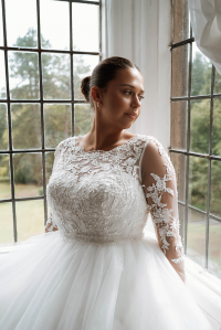 The simplicity of the full princess skirt balances the detail in the lace bodice perfectly, and this gown should definitely be finished with a belt - excellent for upselling.