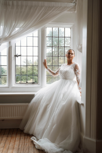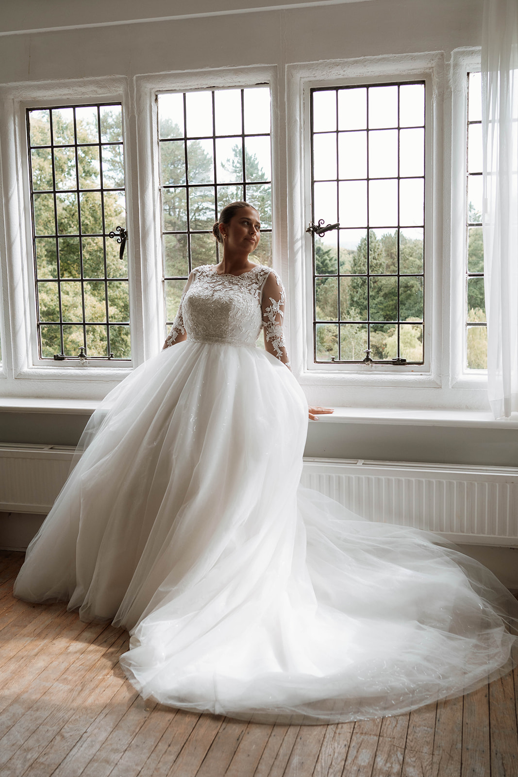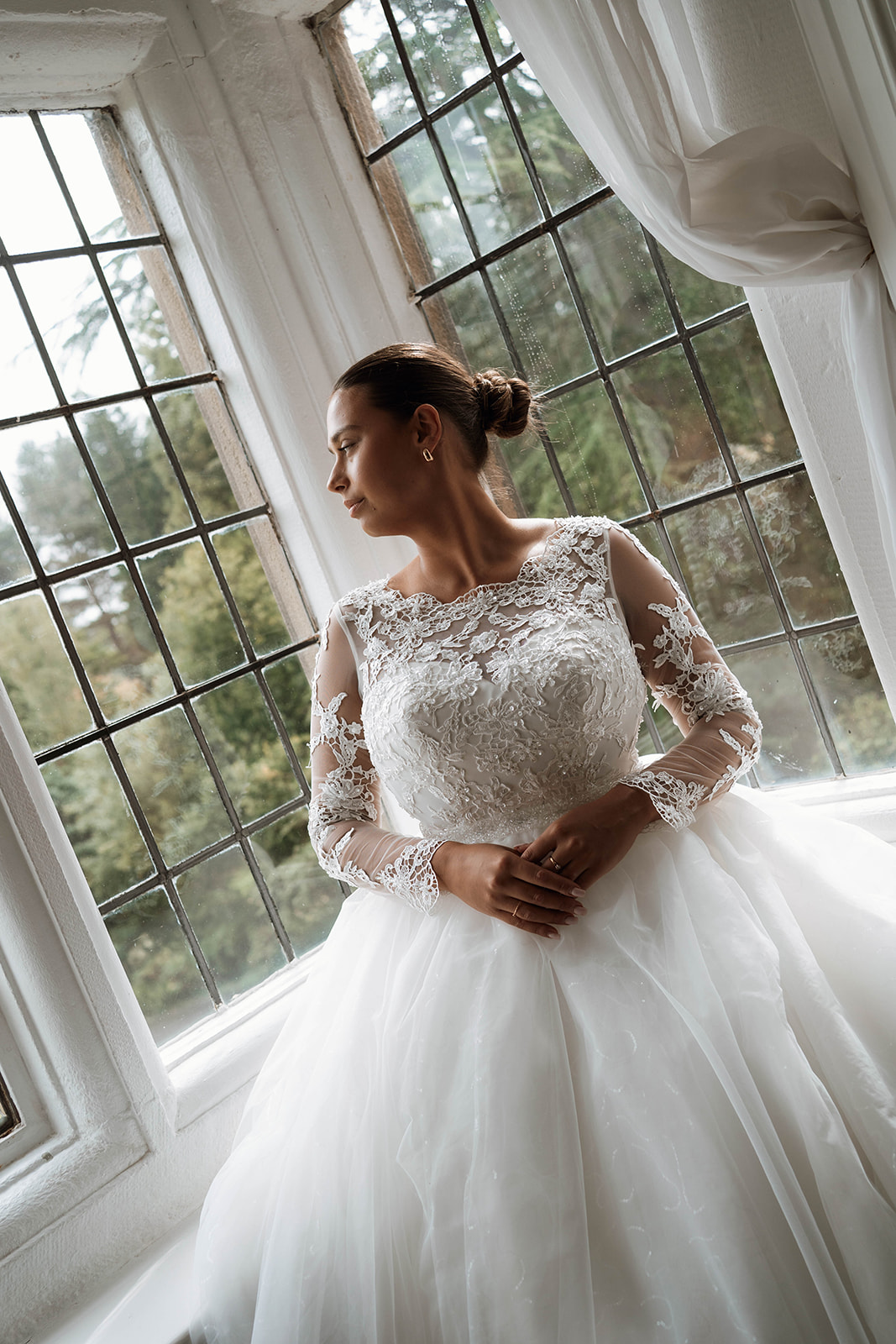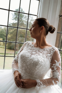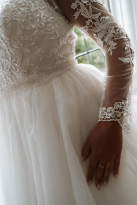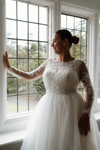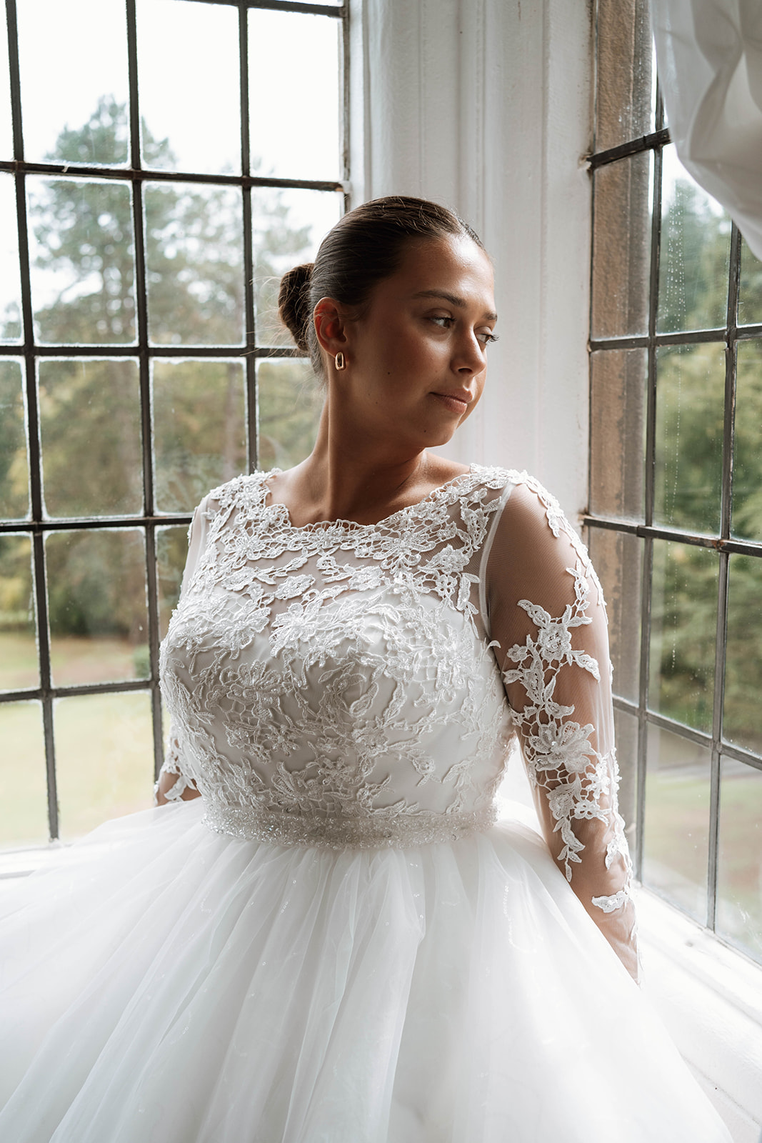 This princess gown's huge selling point is her beautiful full lace sleeves.