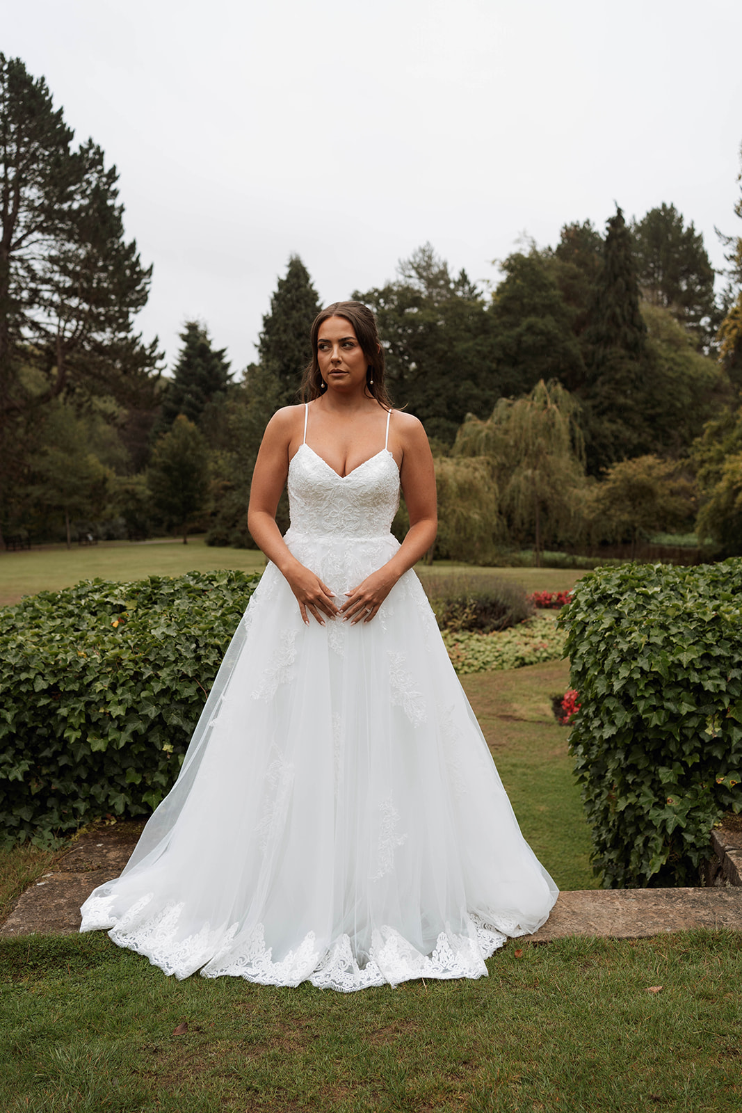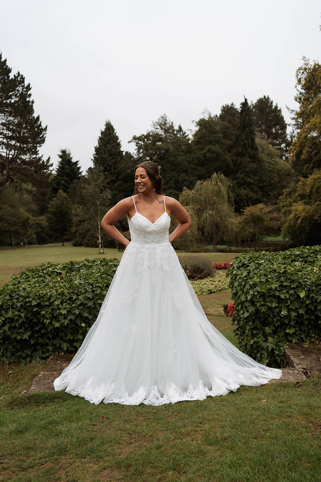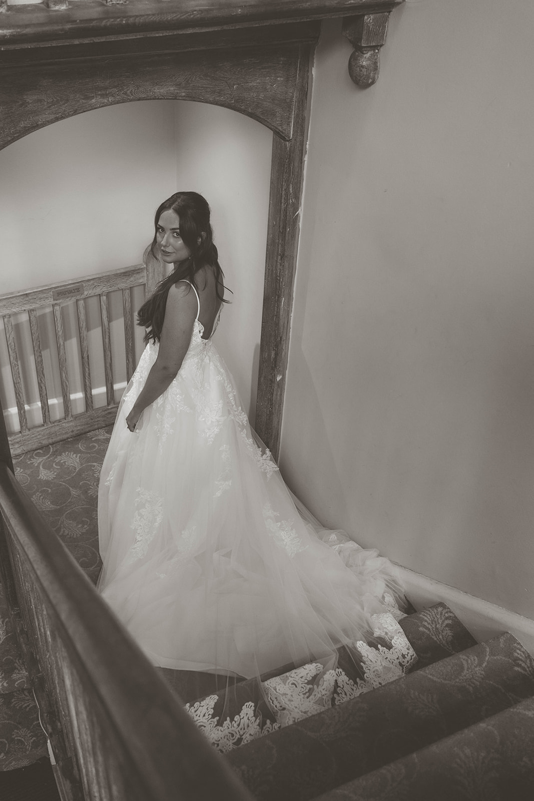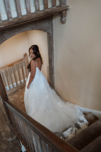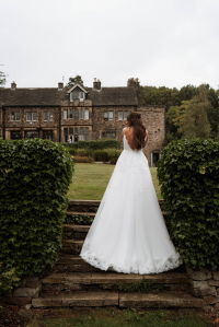 The elegant low back with scalloped lace detailing mirrors the stunning detailing at the hem, creating a beautiful silhouette on the aisle.