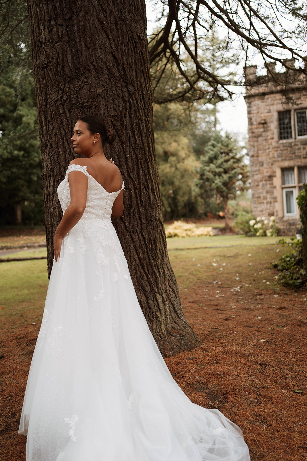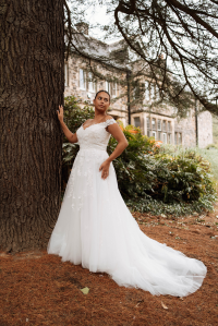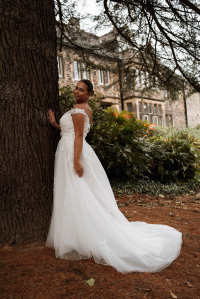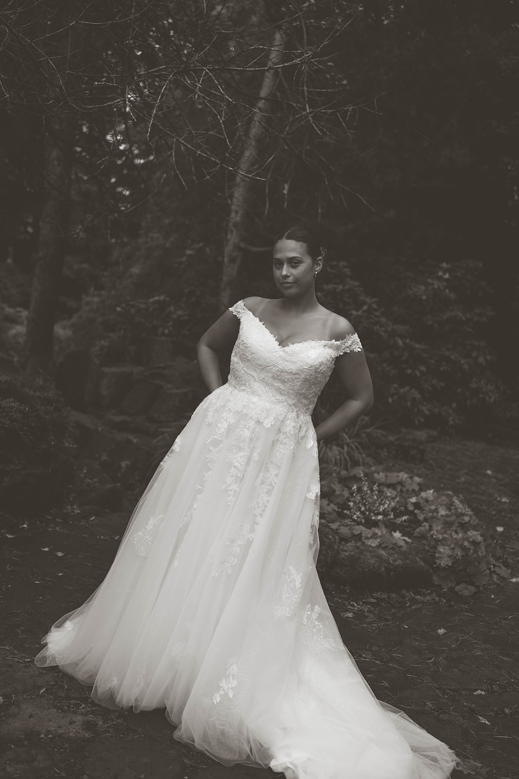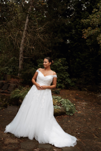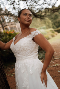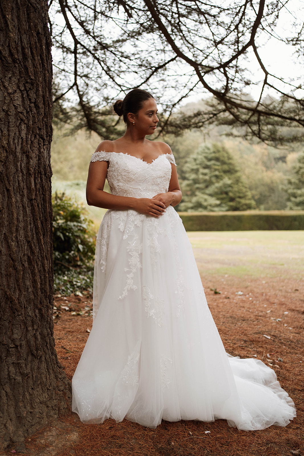A symphony of floral lace appliques soften her neckline and seamlessly flows into off the shoulder straps.