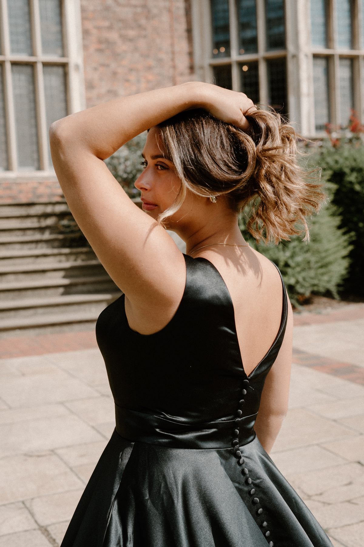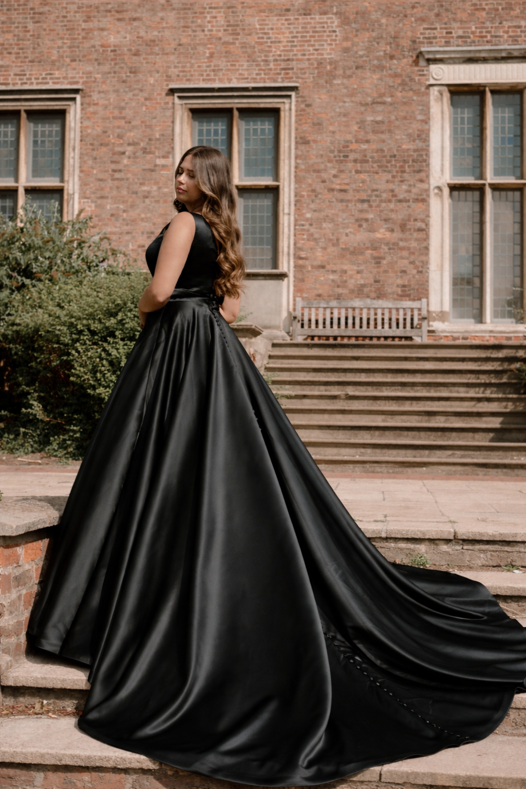 A gown that needs no introduction... the WD149! But this time make her noir. She is the classic, sleek, princess gown with a modern edge. The black satin bodice has the support every bride desires. The low V-neck contours your bust and the thick satin belt cinches the waist perfectly. The train is adorned with buttons, adding that feminine element... and of course she’s got pockets!