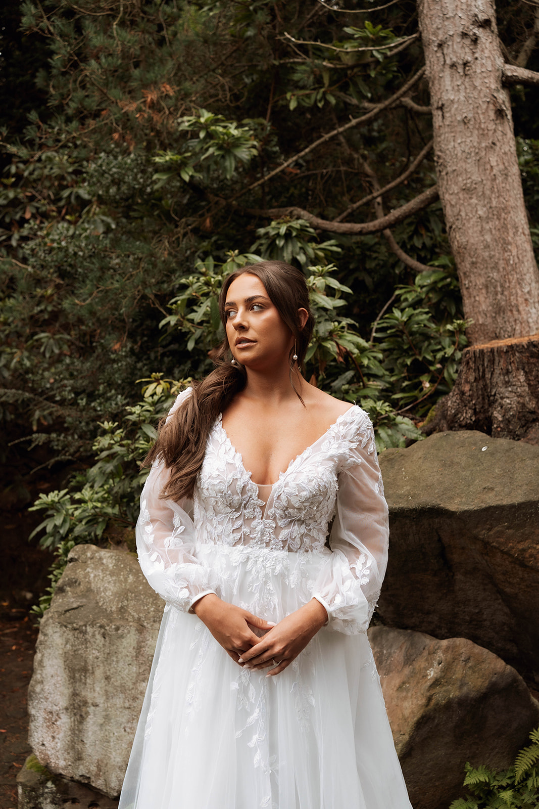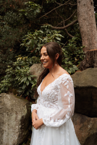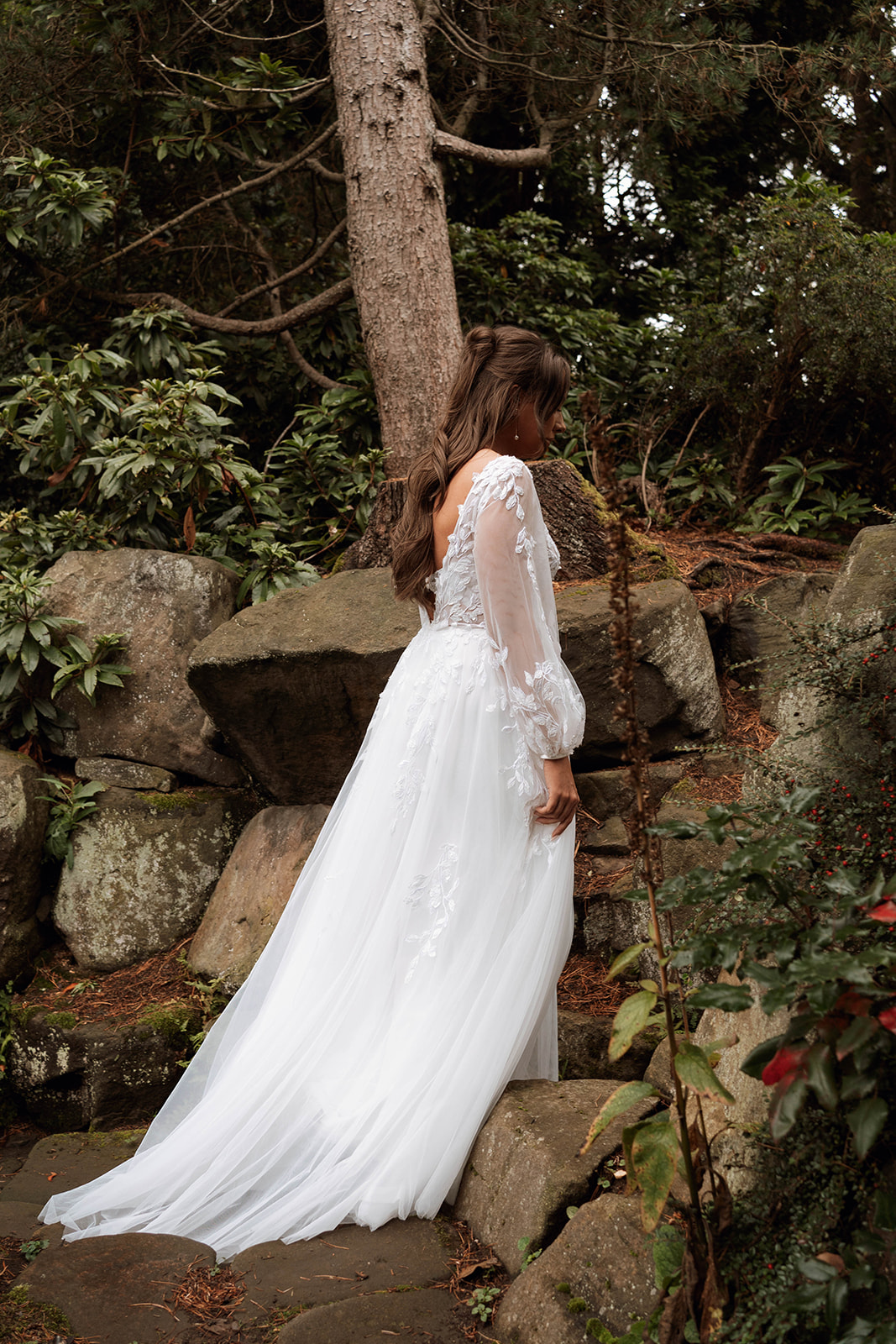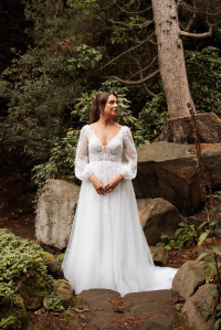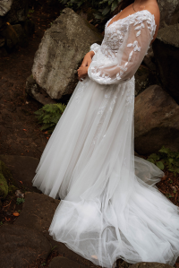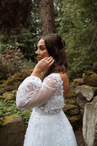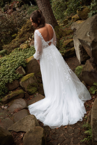 Sheer long sleeves with beautiful lace appliqués and a skirt of layered soft tulle complete this feminine look.