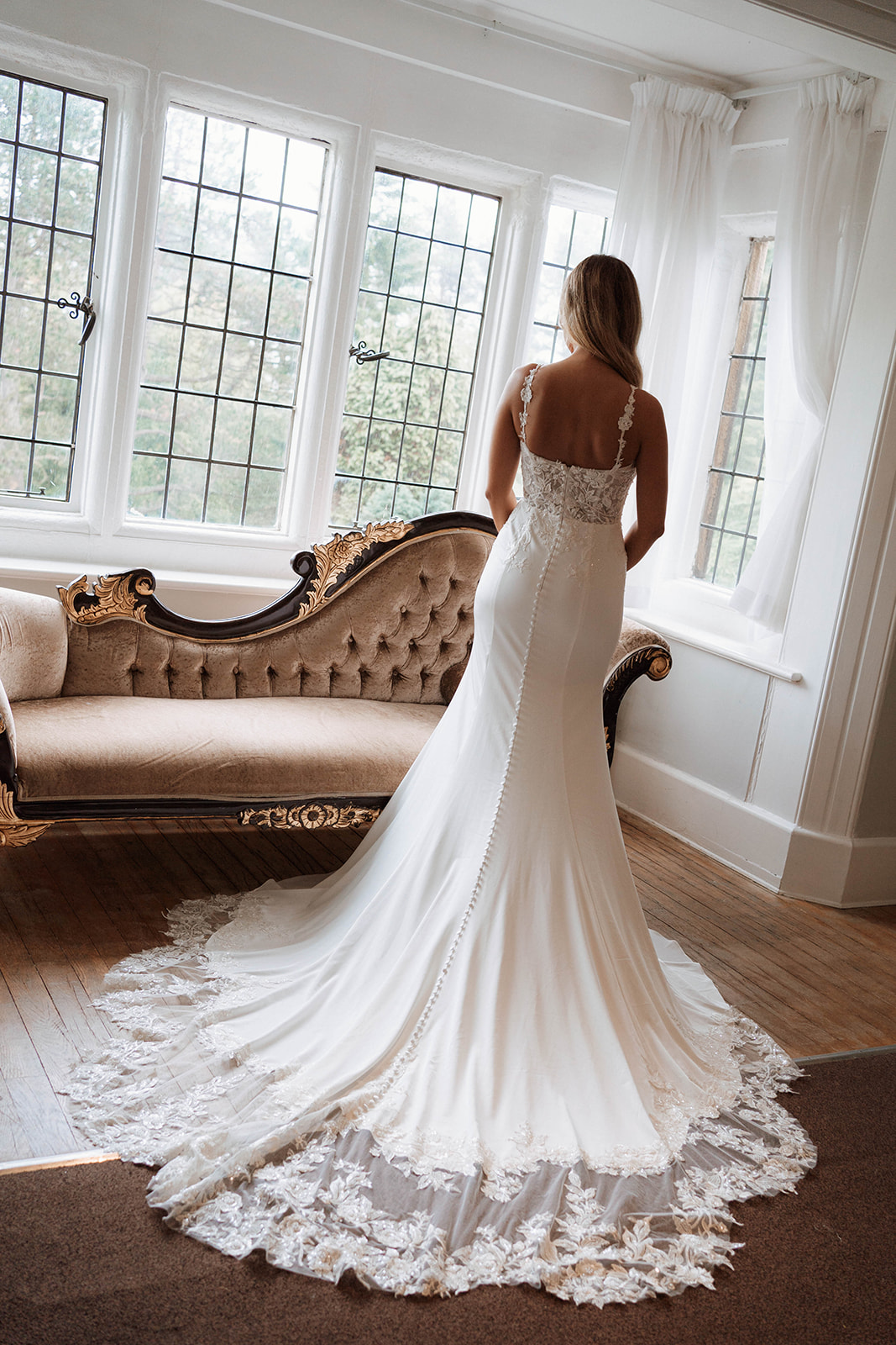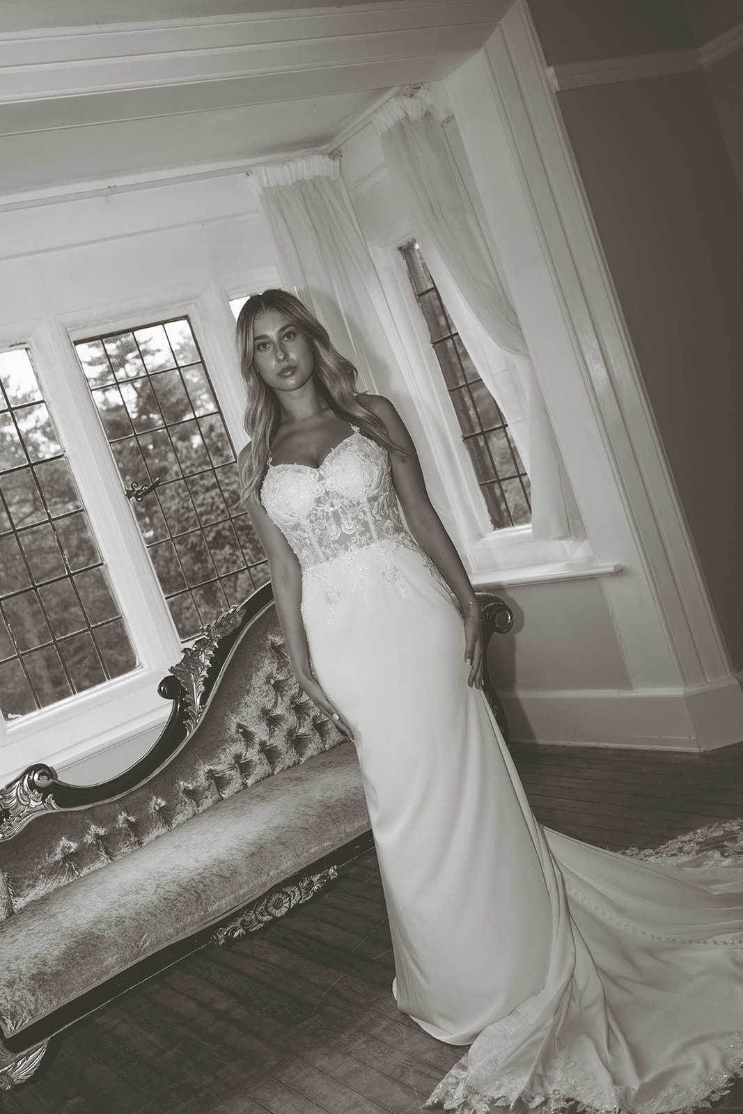 Sparkle and crepe the perfect balance! Hello WD172! The beautifully intricate bodice of the dress shimmers as the crepe fabric flows gracefully, creating an elegant silhouette that moves effortlessly with each step. The delicate lace detailing on the straps adds a touch of timeless romance, while the subtle sparkle of embedded beads catch the light.