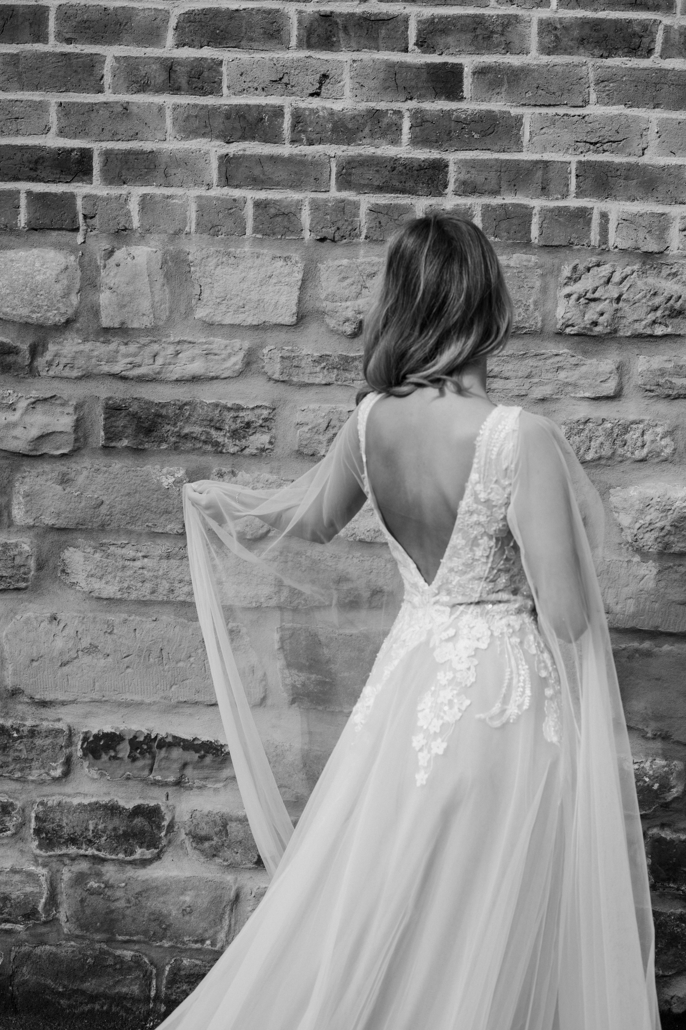 Step into a world of romance with WD177, a breathtaking gown designed for the modern fairytale bride. Featuring a delicate bodice adorned with intricate floral lace appliques, this dress blends sophistication with ethereal beauty. The plunge neckline and tulle cape that drapes dramatically from the shoulders adds a touch of timeless elegance, while the soft tulle skirt cascades effortlessly for a dreamy, flowing silhouette. The subtle nude underlay enhances the lace detailing, creating a captivating contrast that exudes modern charm.